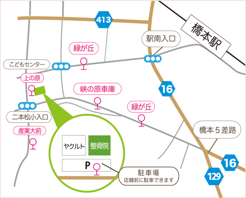 国道16号線、橋本五差路を二本松方面に進み、神奈中バスの車庫を越えて、その先の信号角を右折してすぐ(お気軽にお訪ねください)